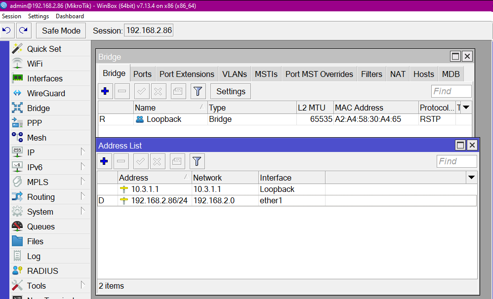 Nos RouterOS podemos criar uma interface Loopback através de uma interface bridge.