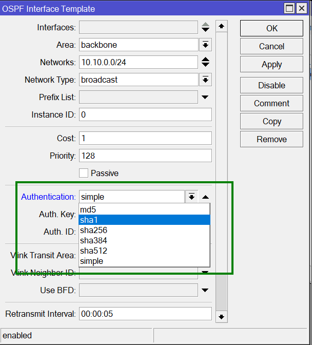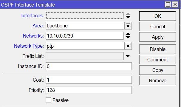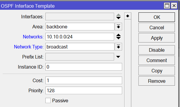 > /routing/ospf/interface-template/add area=backbone networks=10.10.0.0/24 type=broadcast disabled=no