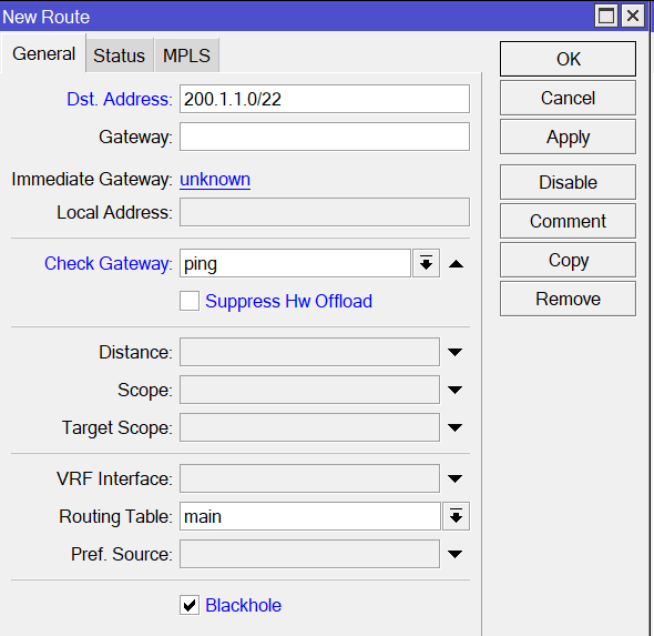 > /ip/route/add blackhole dst-address=200.1.1.0/22 comment=”assinantes PPPoE”